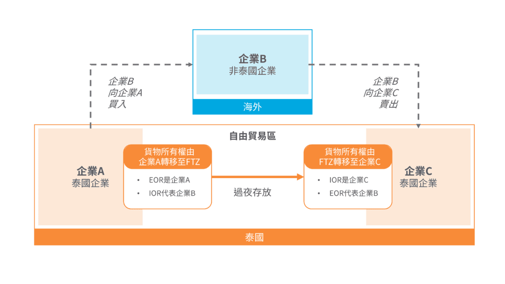 此模式意指將貨物進口至泰國自由貿易區,並在不進入泰國國內市場的情況下再次出口。雖然貨物實際上仍停留於泰國境內,但進、出口的海關手續皆於自由貿易區內完成,從而實現貨物所有權與相關文件的合規轉移。