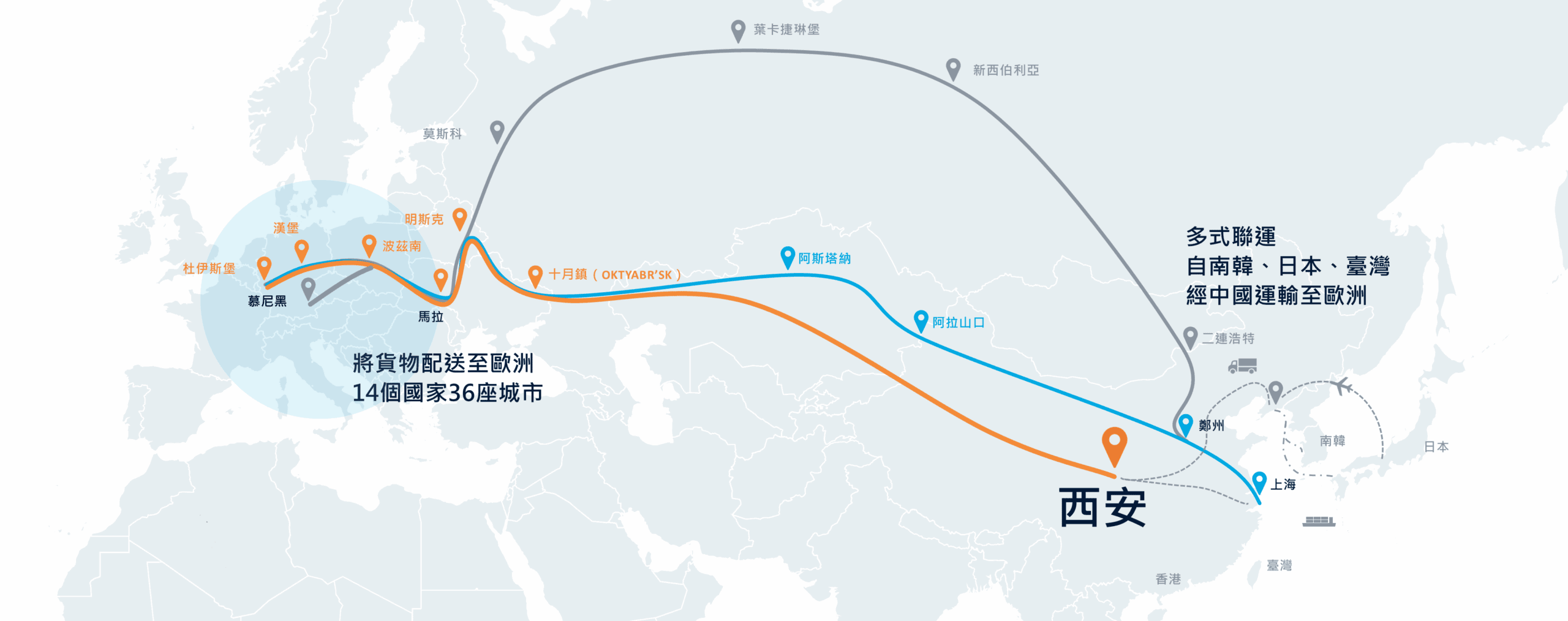 透過鐵路FCL(西安–布達佩斯/馬拉)、鐵路LCL(西安–布達佩斯/華沙)或空運,實現更靈活的路線選擇