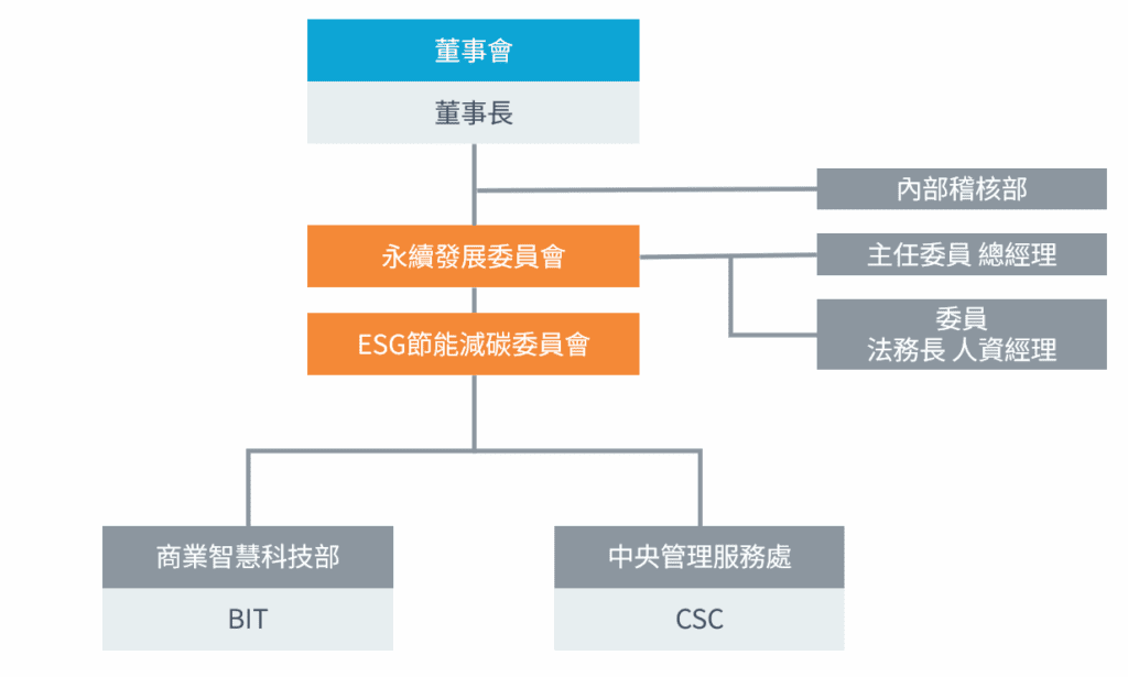 為強化組織在減碳與永續方面之行動,中菲行永續發展委員會特別成立「溫室氣體盤查推動組織」,即ESG節能減碳委員會,負責統籌相關策略方向,並核定年度溫室氣體盤查計畫與報告。由中央管理服務處企劃部擔任執行秘書,統籌監督資源分配與跨部門協調,並由內部稽核部確認資料的正確性與完整性。