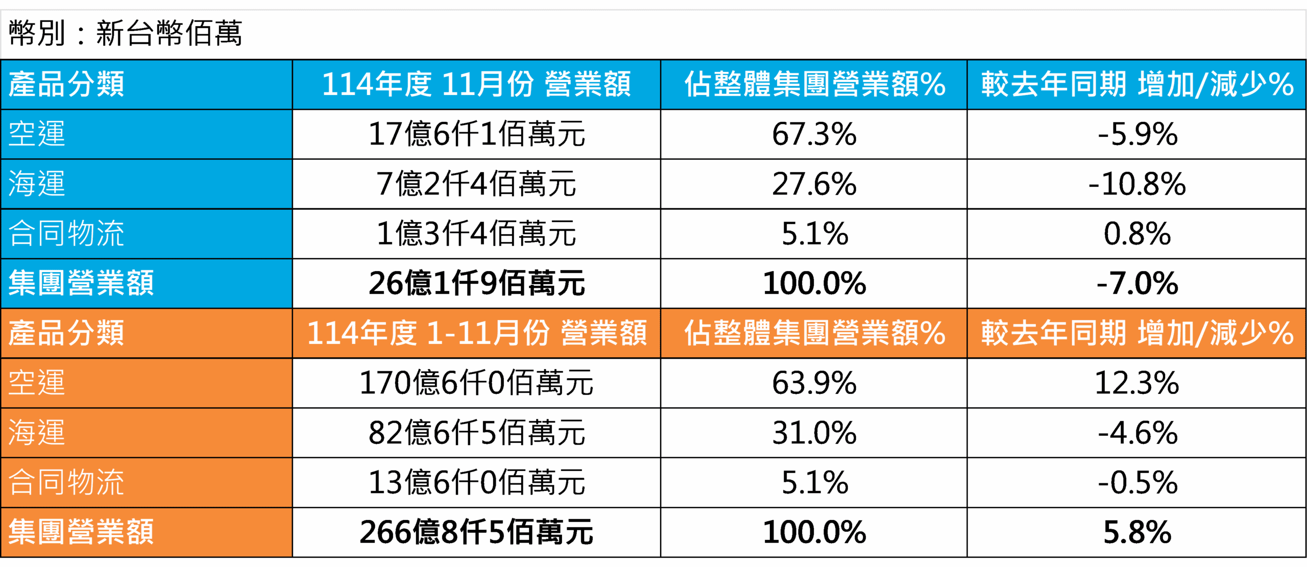 中菲行國際物流股份有限公司(5609)114年11月份自結集團營業額新台幣26億1仟9佰萬元,較去年同期減少7%,較10月增加11.9%,為今年度單月營收新高。受空、海運貨運量同步成長帶動,11月空、海運貨運量較去年同期成長近二成,亦較上個月增加逾一成,但是由於運價較去年同期下降,以致營業額的增長受到影響;累計1月至11月空、海運貨運量較去年同期成長約二成,集團合併營業額則為266億8仟5佰萬元,年增5.8%。