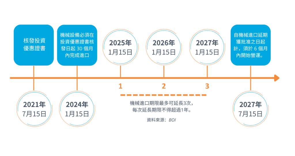 若您的機械符合免稅資格,您必須在投資優惠證書核發後30個月內完成進口。若無法在此期限內完成,您可申請以下兩種延期方式: